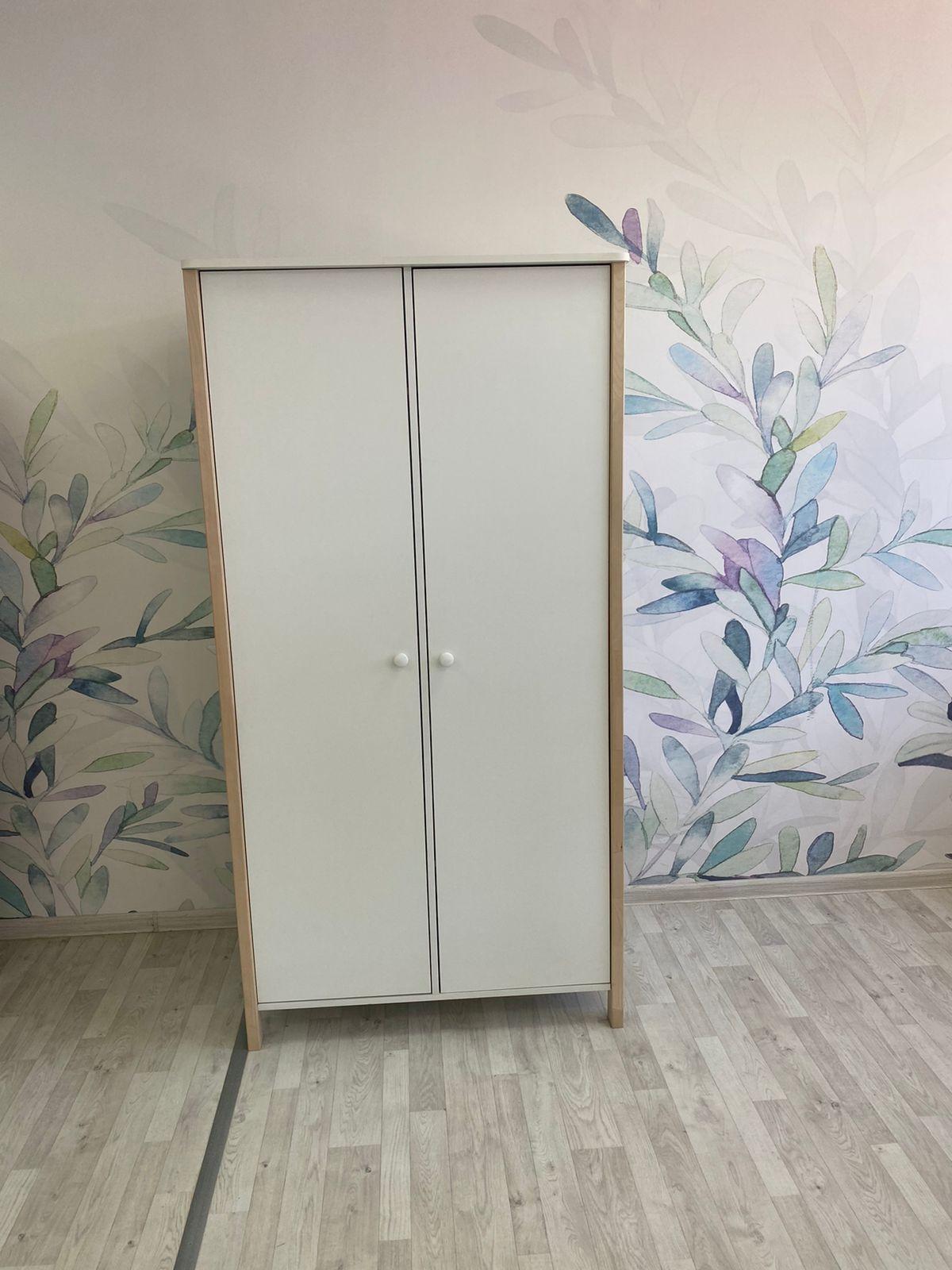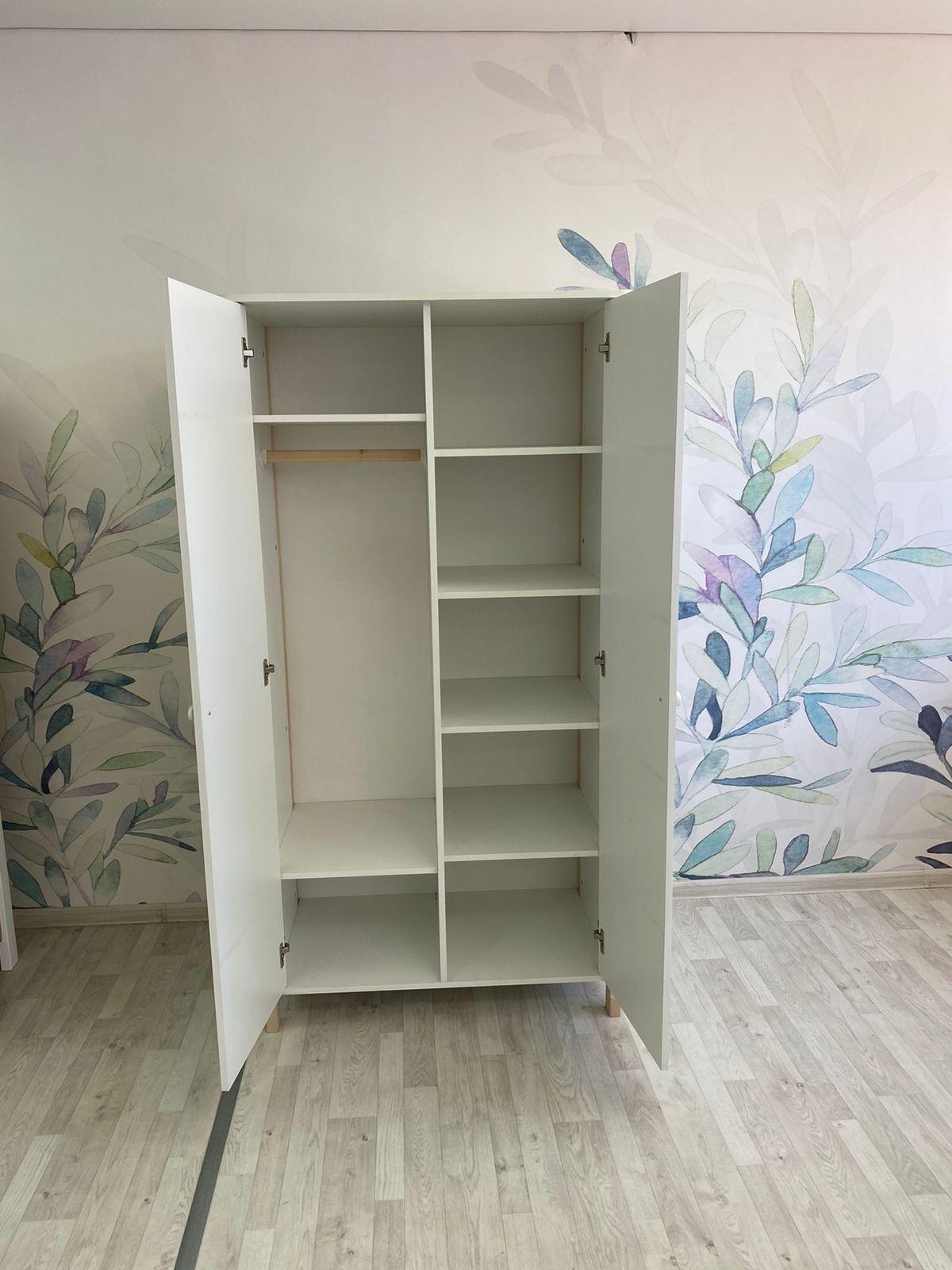 Шкаф СКАНДИ идеально впишется в детскую комнату благодаря классическому стилю и белому цвету. Удобная организация хранения одежды и игрушек. Внутри шкафа есть два выкатных ящика, штанга и пять вместительных полок. Материал корпуса - ЛДСП, фасады - МДФ, ноги массив березы.